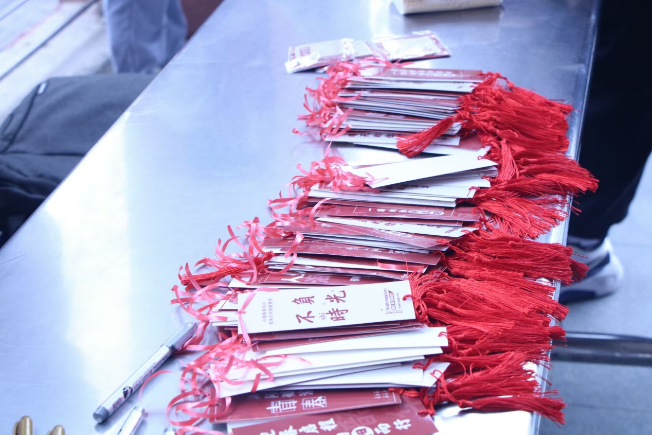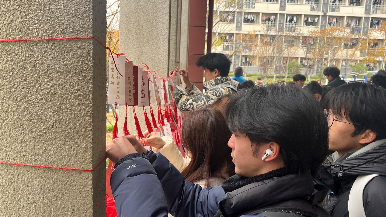 在线下的“备考祈愿”环节中,参与者们在印有“逢考必过”、“前途似锦”等字样的祈愿牌上写下 了各种鼓励的话语,并将其挂在祈愿绳上。无论是考试还是考研,不仅需要平时学习的积累,更需要以积极饱满的精神状态去面对。通过此次活动,希望大家能够缓解备考时的精神内耗与心理压力,增加复习备考的 信心,也祝每个人能顺利通过考试。