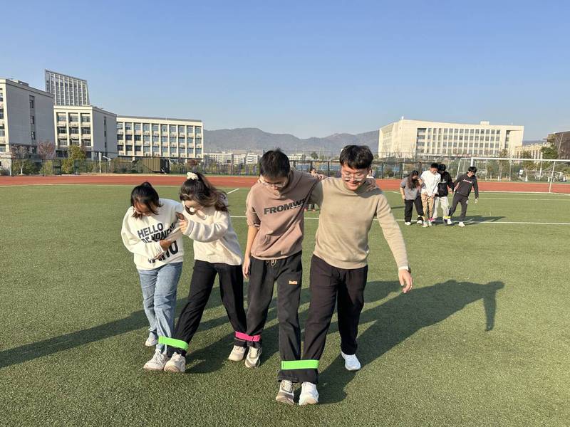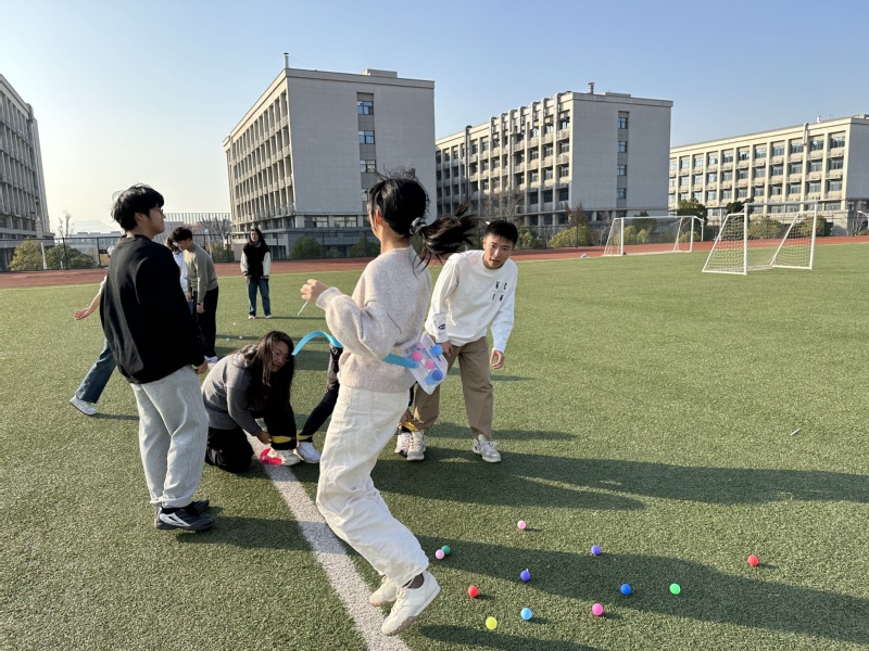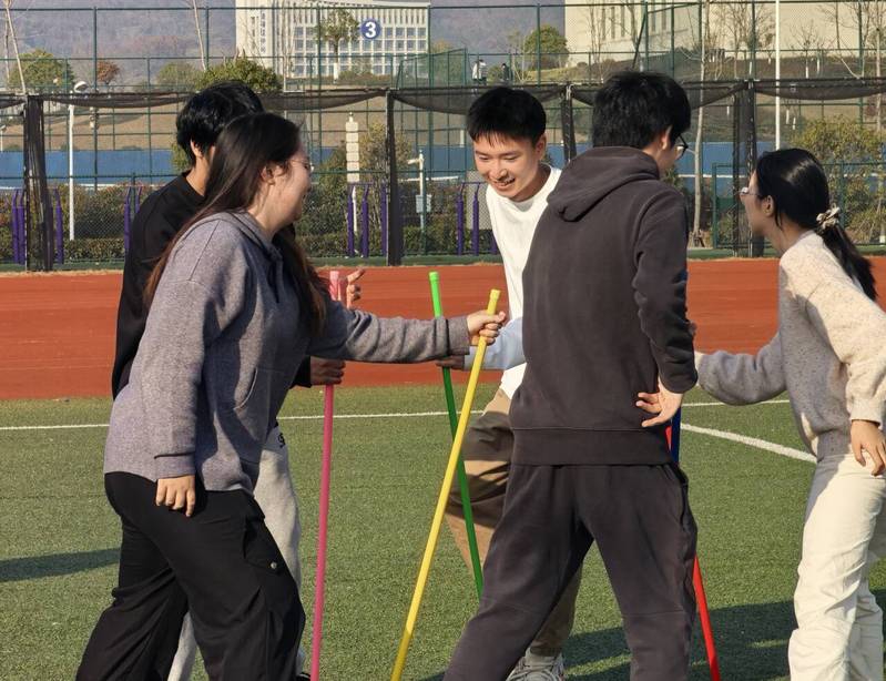 活动现场精心设置了不倒森林、三人两足、臀部抖球等多个兼具趣味性与教育意义的团体项目,2025级全体心理委员身着休闲运动装,以饱满的热情踊跃参与其中。在“不倒森林”项目中,大家手持竹竿围成圆圈,通过眼神交流与口令呼应实现快速轮换,在守护“森林”不倒的协作中,深刻体会到团队同步与信任的重要性;“三人两足”环节里,参赛队员两两并肩、绑紧脚踝,喊着“一二、一二”的整齐口号稳步前行,从最初的步履蹒跚到后来的默契同步,每一步都凝聚着团队合力,也让大家在并肩前行中拉近了心理距离;“臀部抖球”挑战则将现场氛围推向高潮,队员们随着欢快的音乐摆动身体,在趣味比拼中尽情释放压力,爽朗的笑声此起彼伏。整个活动过程中,心理委员们主动打破陌生隔阂,在竞争与协作中加深了解、凝聚共识,现场始终洋溢着积极向上、温馨融洽的氛围。