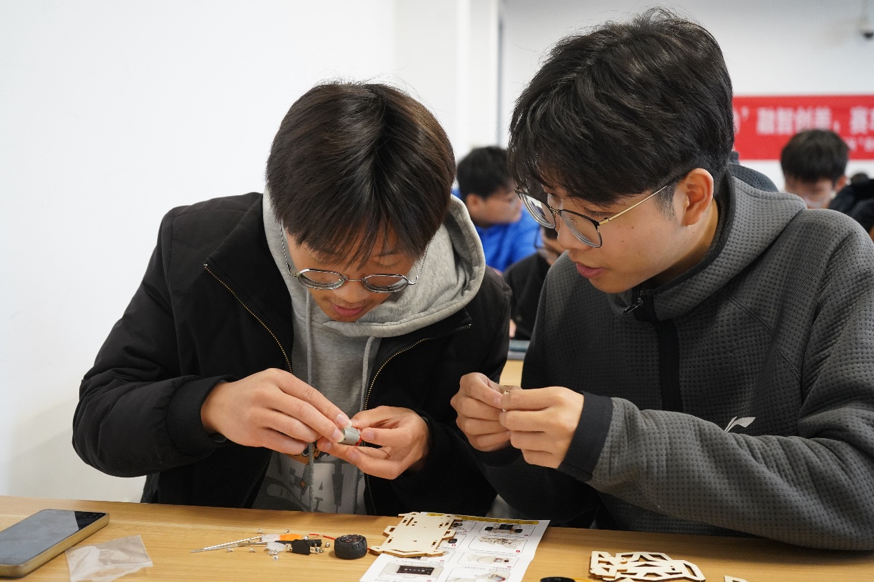 在“机械狂想”环节,参赛选手三人一组,面对桌面上零散的电机、齿轮与木质板材,迅速进入状态。他们需要研读说明书,理清机械传动逻辑,在30分钟内完成赛车的结构组装。这不仅是对动手能力的考验,更是对工程逻辑思维的实战演练。