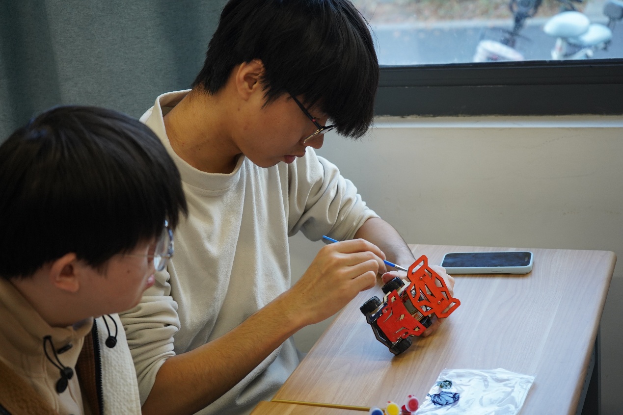 随着齿轮的咬合与螺丝的紧固,一辆辆赛车的雏形初现。紧接着进入“霓虹焕彩”赛车颜值改造计划。各小组充分发挥想象力,将自动化学院的自信精神与个人审美相结合,利用手中的画笔为原本素朴的木质车身披上多彩的战衣。有的车队设计了流线型的火焰纹路,寓意速度与激情;有的则绘制了精密的电路图腾,彰显专业特色。
