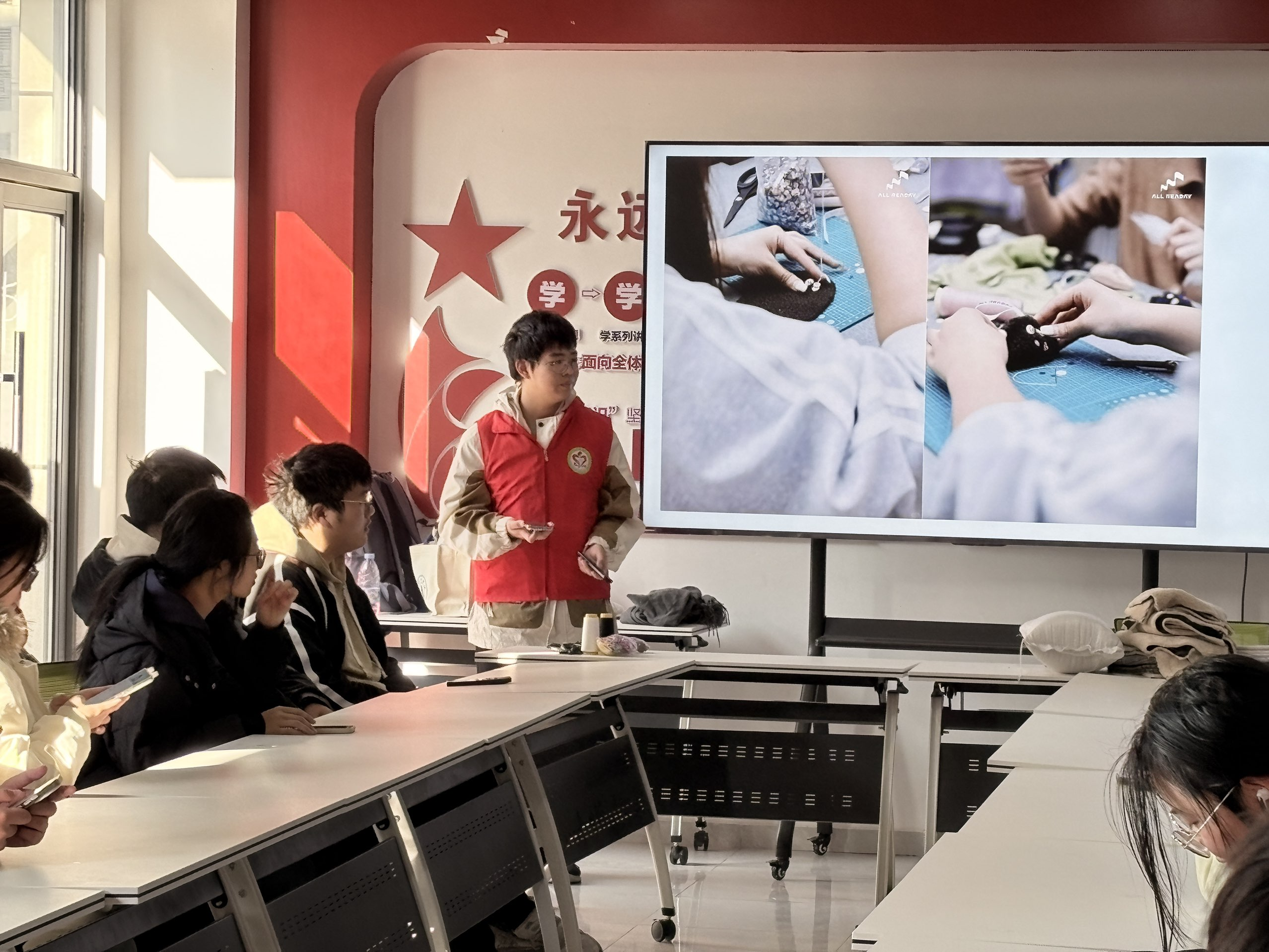 暖冬手作专场如期开启。布艺饺子DIY活动中,印花、毛绒、格纹三类特色物料包琳琅满目,参与者们自主选型后,跟随投屏教程与志愿者的一对一指导,熟练掌握布料裁剪、边缘缝合、填充塑形等技巧。大家充分发挥想象力,或跨界组合材质,用格纹布做主体、印花布饰细节;或巧思点缀装饰,让纽扣、蝴蝶结与立体雪花为作品增色。创作间隙,“材质创意展示区”成为灵感交流的小天地,同学们分享设计思路、互授操作窍门,欢声笑语中,一个个造型萌趣、暖意十足的手工饺子新鲜“出炉”。