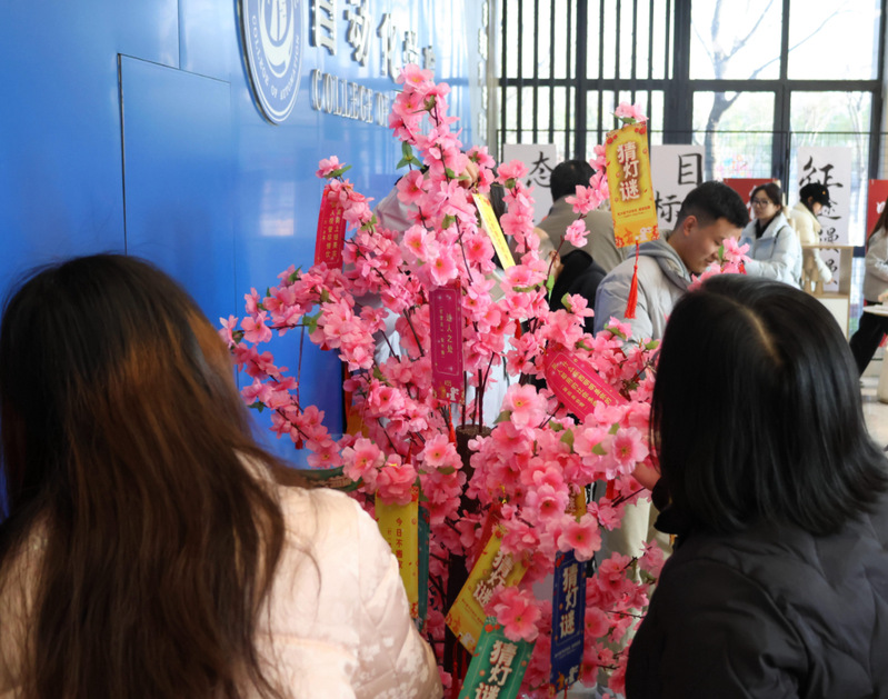 灯谜区域人气爆棚,现场悬挂的灯谜内容丰富多元、难易层次分明,吸引师生们驻足思索、踊跃竞猜。大家或独自凝眉思索、悉心推敲,或三五成群轻声研讨、交流思路,眼神中满是专注与探究之意。