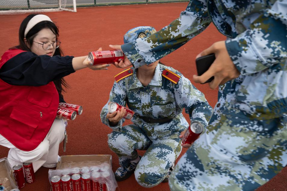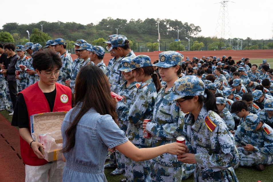 志愿者们早已将一箱箱定制可乐整齐地摆放在训练场边,每一瓶可乐上都清晰地印着对应新生的姓名,这份专属的小细节让同学们感受到了学院的用心。志愿者们来自各年级的学长学姐,他们身着红色志愿服,迅速穿梭在各个军训队列之间,将可乐递到大家手中。红色的志愿身影在蓝色的军训服中格外显眼,如同夏日里的阵阵清风,为炎热的训练场带来了别样的清凉。