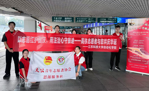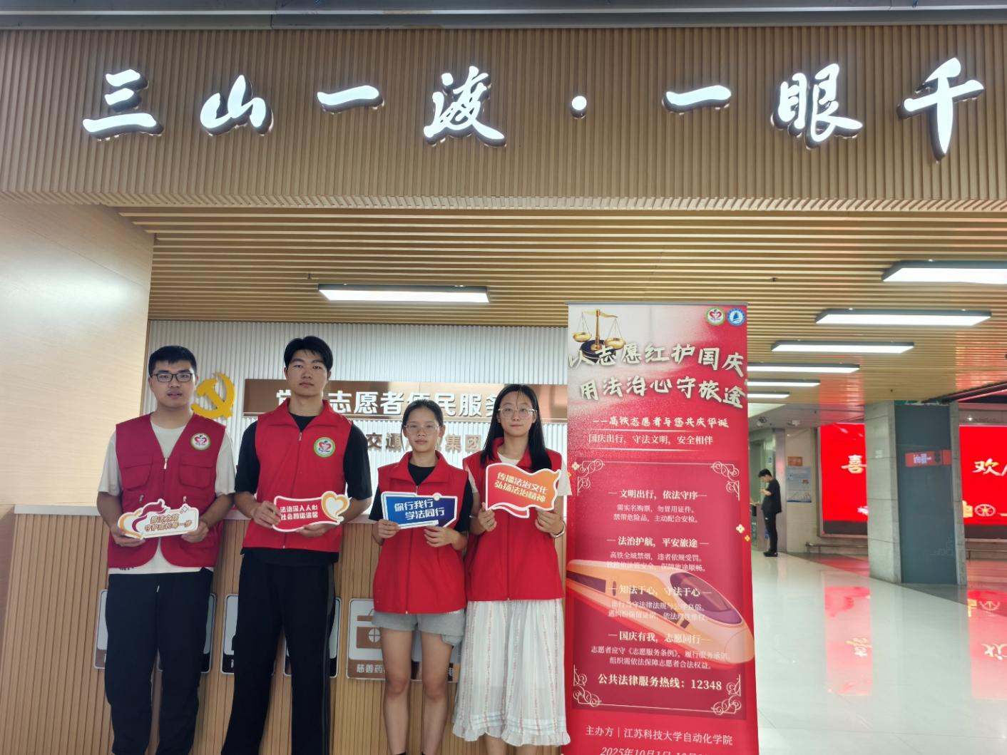 为弘扬志愿服务精神,营造平安有序、文明和谐的国庆出行环境,2025年10月7日至8日,自动化学院思源服务社在镇江站北出站口组织开展了“以志愿红护国庆,用法治心守旅途”主题志愿服务活动,将法治宣传与出行服务相结合,为旅客的归途增添了一抹温暖的“志愿红”。