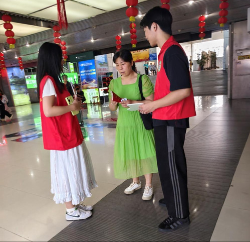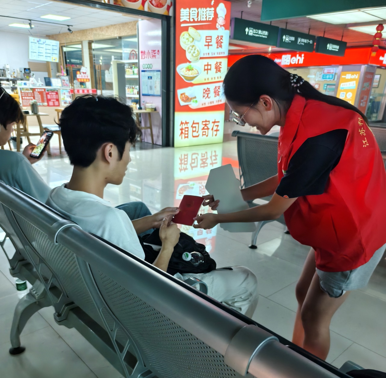 活动期间,身着统一服装的学生志愿者们主动上前,向过往旅客发放精心准备的宪法宣传册等普法资料,围绕《铁路法》《治安管理处罚法》等法律法规,用通俗易懂的语言向过往旅客讲解出行安全、票务权益、防骗防盗等实用法律知识,并现场解答旅客关于遗失物品维权、打车纠纷等常见法律问题,引导大家树立“办事依法、遇事找法”的法治观念。