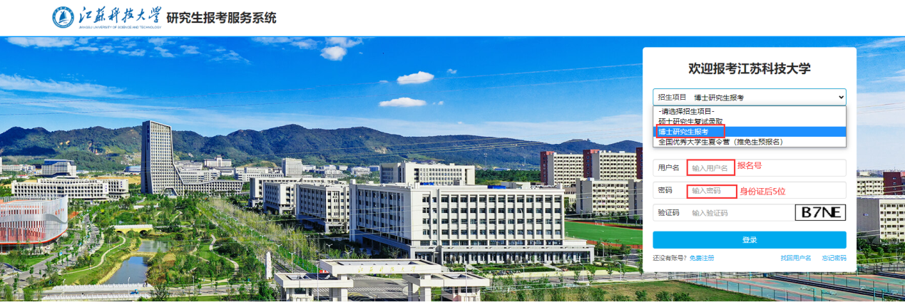 1、登录江苏科技大学研究生招生管理系统【用户名:报名号,密码:身份证号后五位】,登录方式如下
