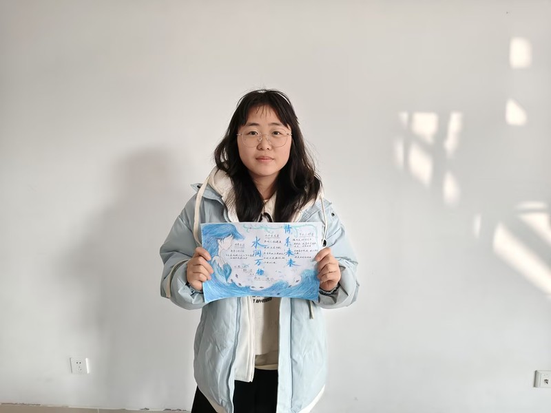 图为同学展示自己对水润万物的手抄报(柳越 供图)